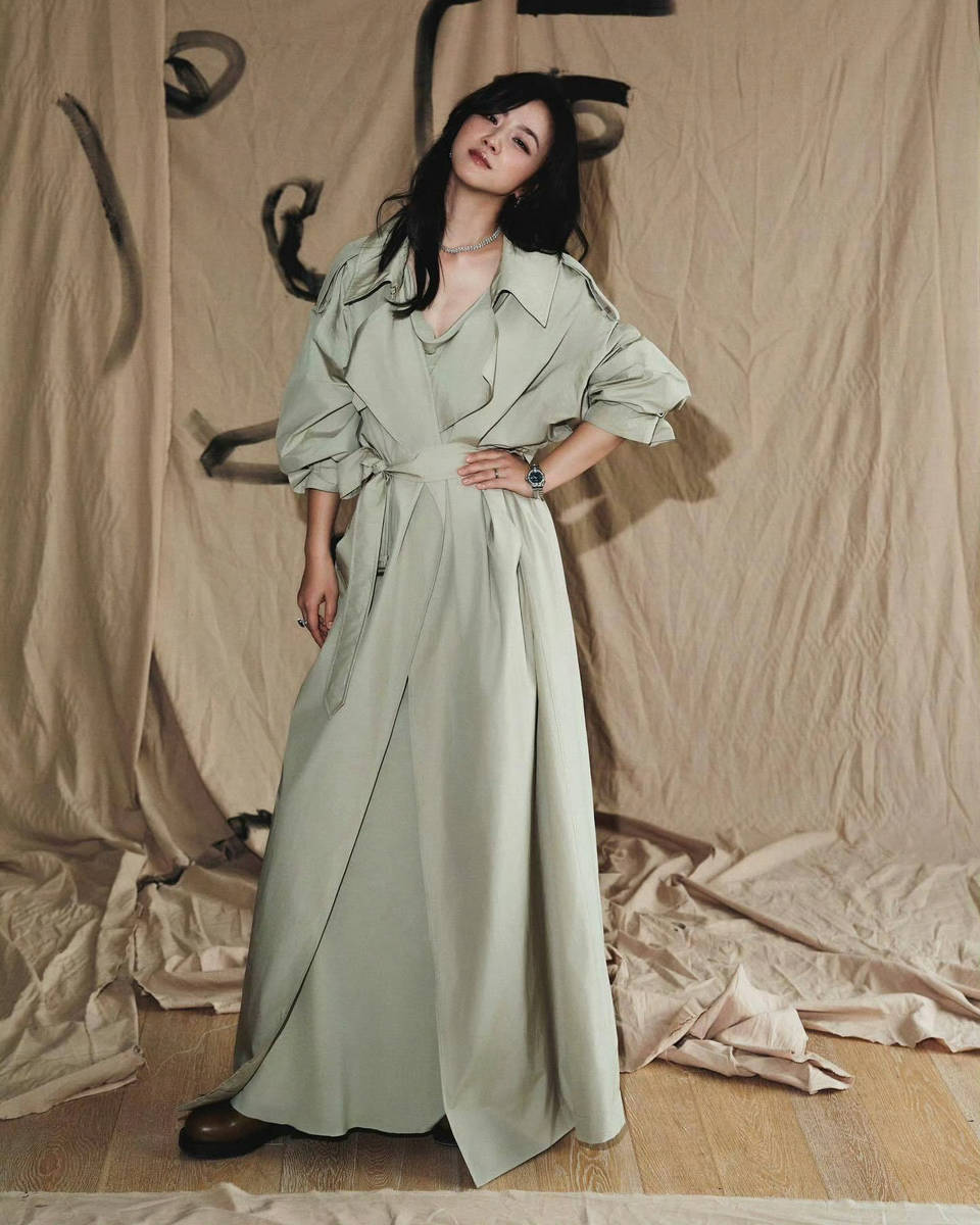 比起那些在影棚里凹造型的硬照,这组大片最打动人的,是它把「时尚」拽回了生活的地面。汤唯没有踩着十厘米高跟鞋在菜地里摆拍,而是穿着舒服的平底鞋,裤脚甚至沾了点泥点;她没有对着镜头强装气场,而是自然地笑着,露出眼角的细纹——这些「不完美」反而成了最戳人的细节。就像她身上那件亮绿色皮衣,本该是凌厉的时尚单品,却被她穿出了「在菜园里发现一抹春色」的惊喜感,连Burberry的英伦腔调都染上了烟火气。